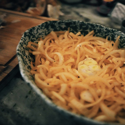 About 15 minutes before the onions are done, bring a large pot of salted water to a boil and cook the reginetti, reserving ½ cup of pasta water before you drain the pot. Cue up our playlist timer for a perfect al dente bite (about 8–10 minutes)!