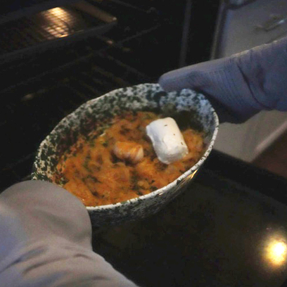 Reduce the heat to 375°F, remove the dish, and place the goat cheese in the center. Bake for another 10–12 minutes, until the cheese melts into the onions.