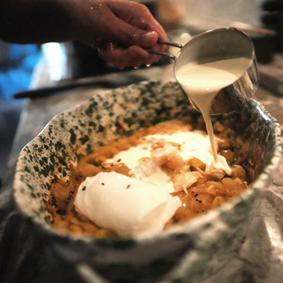 Remove the dish from the oven and squeeze the roasted garlic from its skins before pouring in the heavy cream and mixing it all together into a velvety sauce.