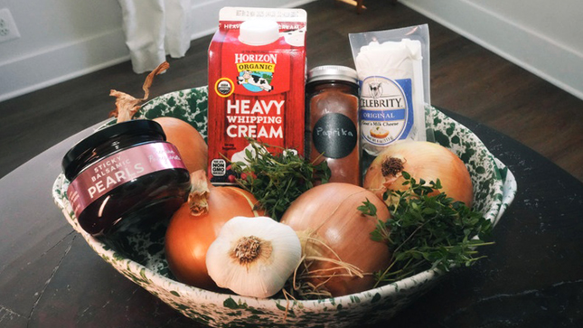 Preheat the oven to 400°F and toss the sliced onions with olive oil, salt, pepper, and paprika in a wide oven-safe casserole dish. Slice the top off the garlic bulb, drizzle with a bit more oil and salt, and nestle it right into the onion mixture.