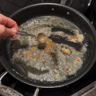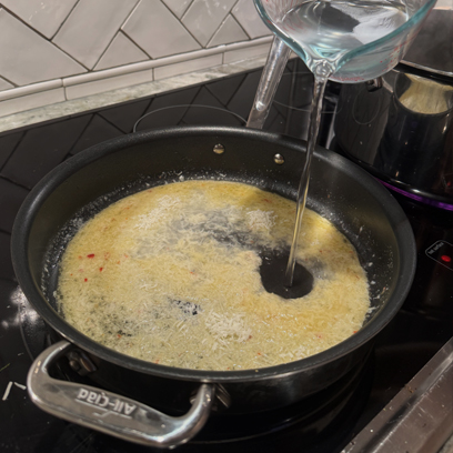 In a wide skillet over medium heat, melt butter. Add garlic and chili flakes, cooking until fragrant (30–60 seconds).