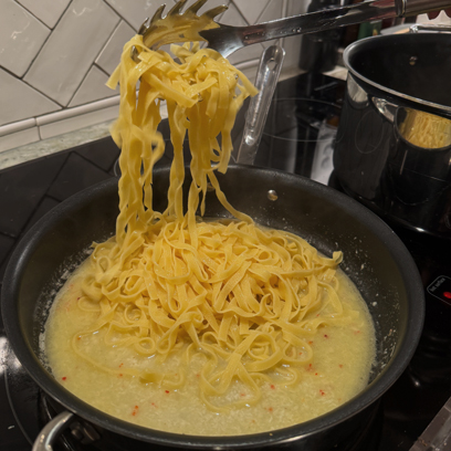 Bring a large pot of salted water to a boil. Cook the fettuccine until just al dente (2–3 minutes) — our playlist has you covered, so you don’t miss the cue (or the chemistry)! Reserve 1 cup pasta water, then drain.