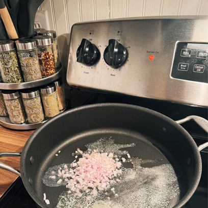 Heat olive oil or butter in a wide skillet over medium-low. Add shallot and sweat gently until soft.