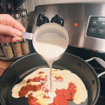 Pour in the vodka and simmer for 2–3 minutes until the alcohol smell mellows.